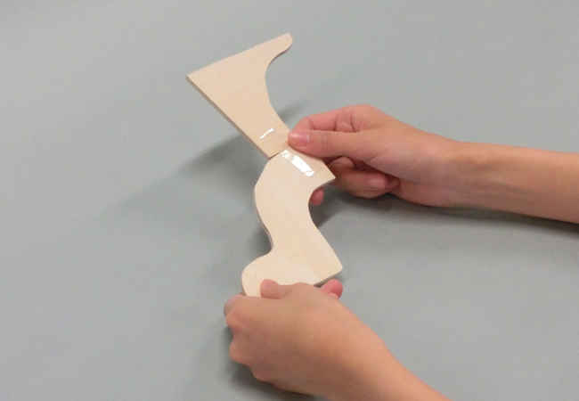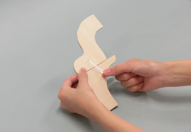 木材の貼りつけ方 1.木材を貼りつける 2.仮どめする 1.木材を貼りつける 木材を貼りつける方法を確認しましょう。 お使いのブラウザは動画の再生に対応していません。以下のリンクより動画をダウンロードして,再生して下さい。 動画をダウンロード 2.仮どめする セロハンテープなどを使って仮どめすると、木の組み合わせを何度もやり直すことができます。 セロハンテープで木と木を貼りつけ、仮どめします。