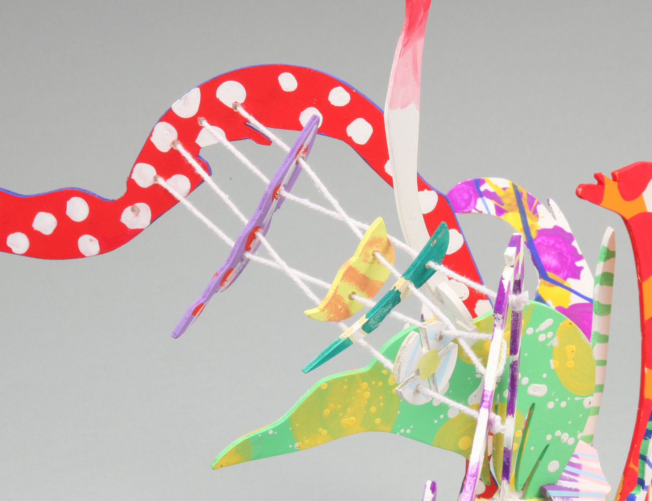 ギザギザに切った板にいろいろな模様をつけて、鮮やかなニワトリの羽を表現しています。細長い板をタテにして組み合わせることで、高さのある作品になりました。