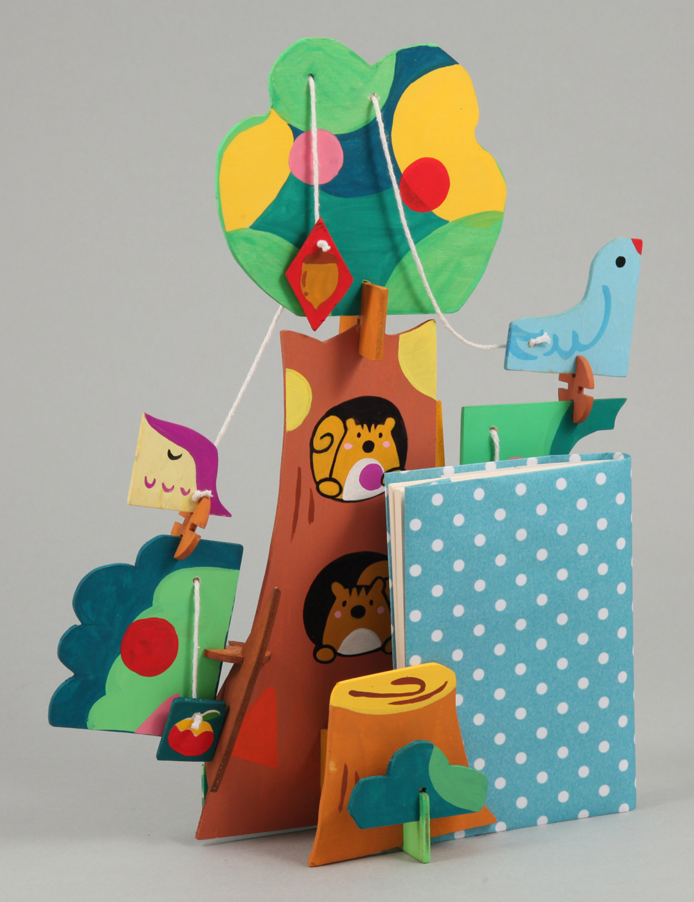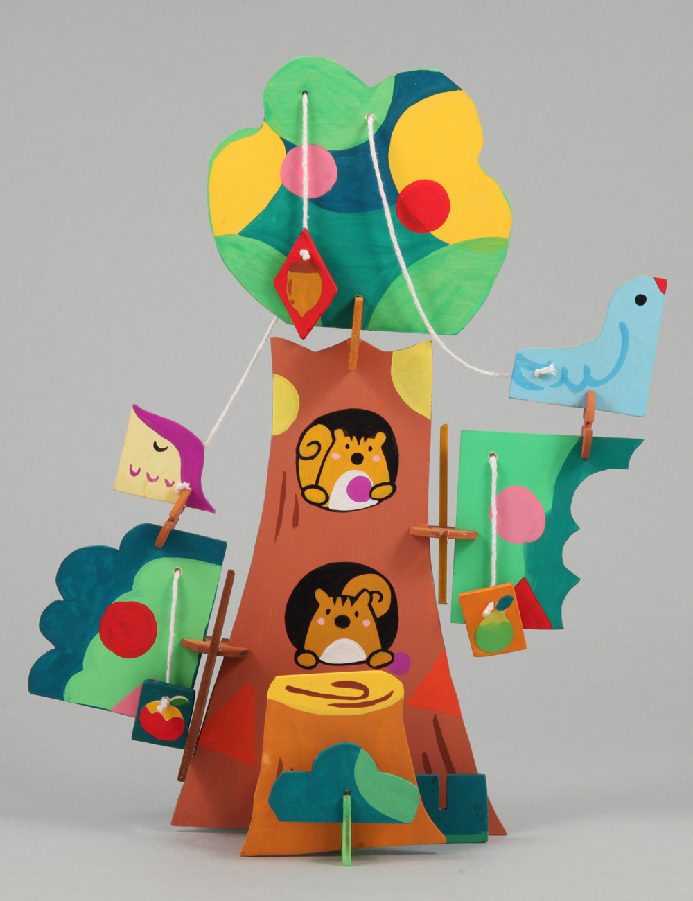 丸型ジョイントパーツを使って葉のパーツをいろいろな方向に組み合わせることで、リスが住む大きな木を表現しました。 木の実の飾りはたこ糸でつり下げているので、ゆらゆらと揺れます。