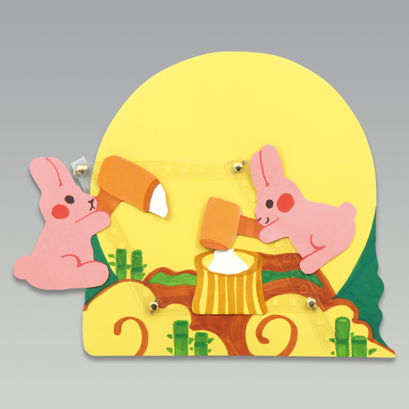 「左右に動く仕組み」を使ってうさぎのもちつきをつくりました。絵を描くときにもちがくっついて見えるように工夫しました。
