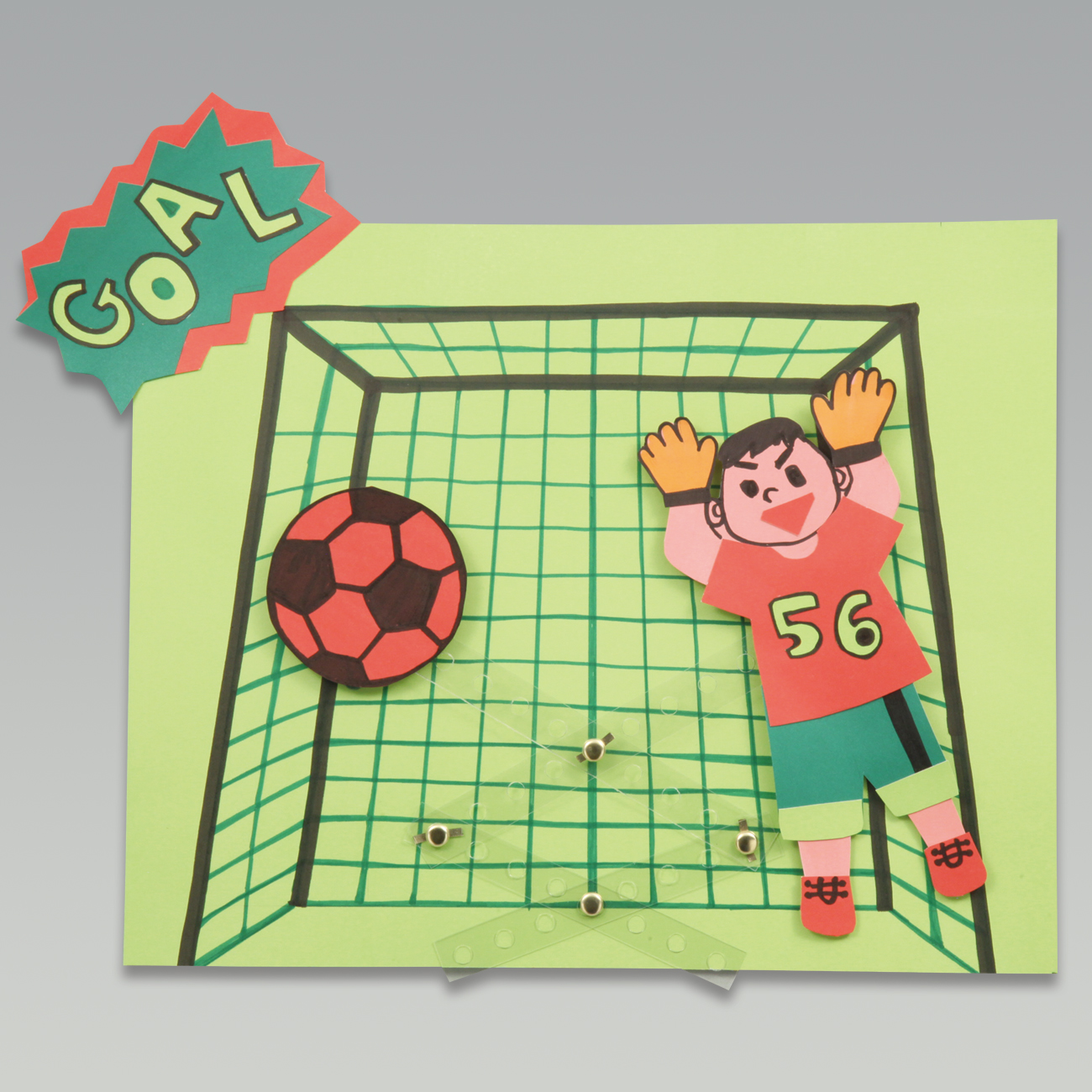 「のびる仕組み」を使ってシュートを止めるキーパーをつくりました。先端にボールとキーパーを貼りつけることでダイナミックに動きます。
