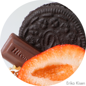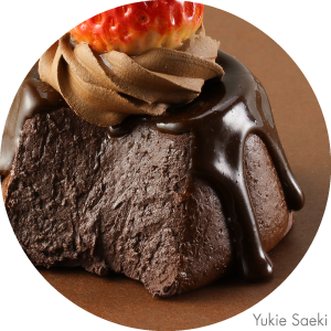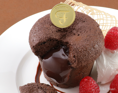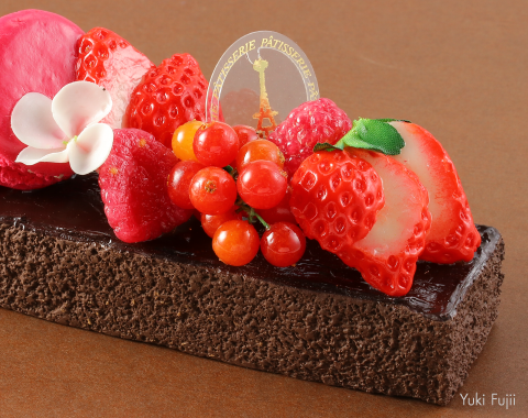 Use straight cuts on the bubbly, crumbly texture of Choco Bake, then add a finishing touch with bright red fruit and chocolate sauce