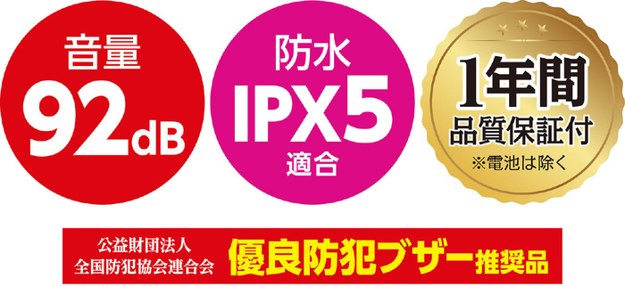 # 仕様約54×78×30mm、●音量/92dB●連続吹鳴時間/120分以上(25℃)●防水性能/IPX5●使用電池/単4乾電池2本(付属)※生活防水(IPX5)とは防水性能の等級で、内径6.3mmの注水ノズルを使用し、約3mの距離から12.5L/分の水を最低3分間注水する条件であらゆる方向から噴流を当てても、防犯ブザーとして有害な影響がないことを表す等級です。、本体重量:約65g(電池を含む)