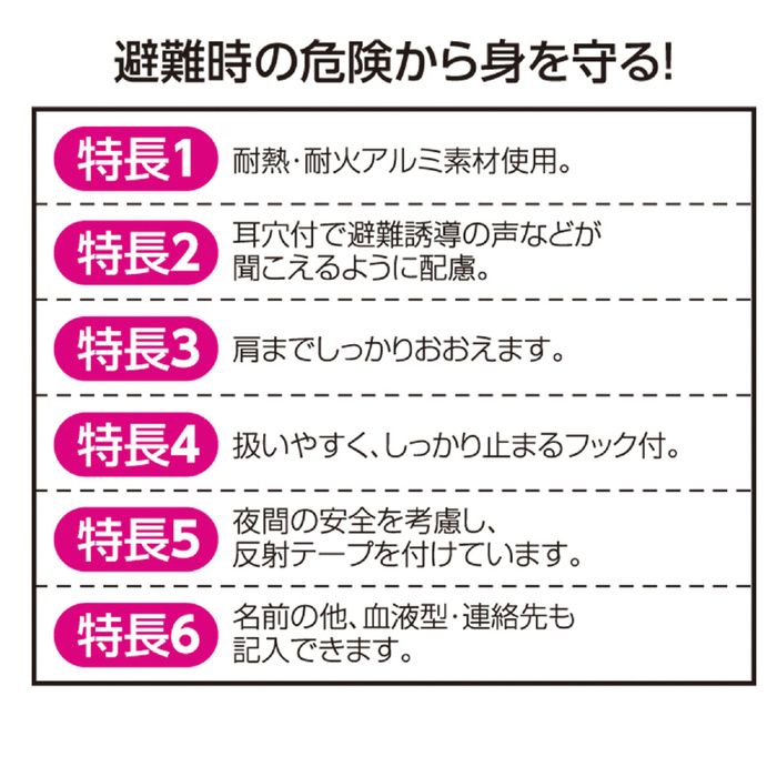 肩までしっかりガードできる防災ずきんです。避難時、外の音もよく聞こえるように耳穴が開いています。夜間の安全を考慮した反射テープ付です。名前・血液型・連絡先が記入できる欄付きです。別売の背もたれカバー(紺/JAN:4521718039800、えんじ/JAN:4521718039787、薄水色/JAN:4521718521633)に収納することで椅子に取り付けて保管することができます。