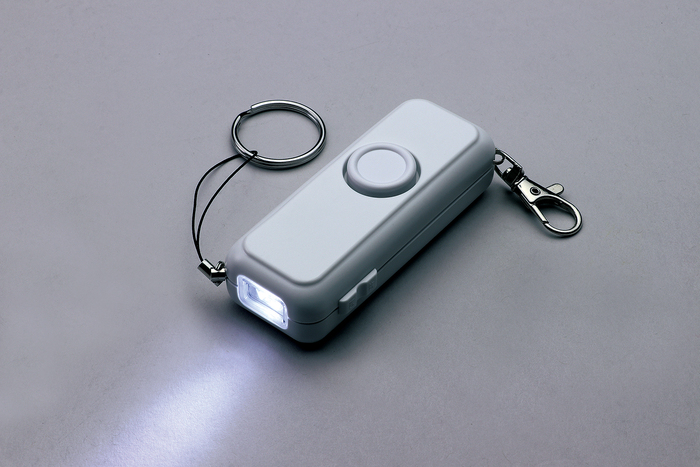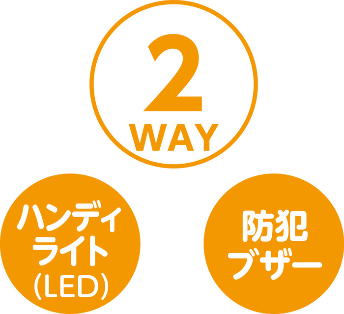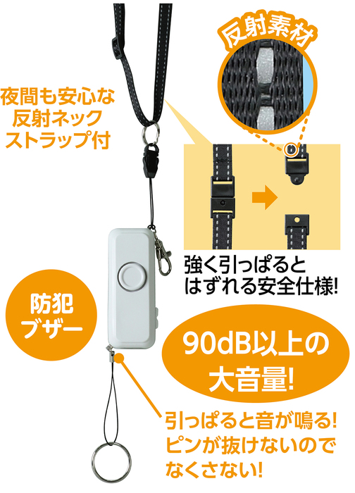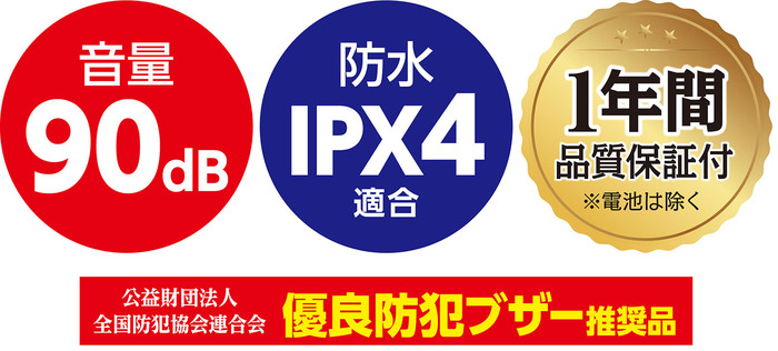 # 仕様約90×35×25mm、●音量/90dB●連続吹鳴時間/150分以上(25℃)●防水性能/IPX4●使用電池/単4乾電池2本(付属)●ライトの明るさ/300ルクス以上(測定距離0.3m)※生活防水(IPX4)とは防水性能等級で、散水装置を用い、鉛直方向に対して±180度位置から10L/min±0.5L/minの水量で最低5分間の散水しても浸水がない、防犯ブザーとして有害な影響がないことを表す等級です。