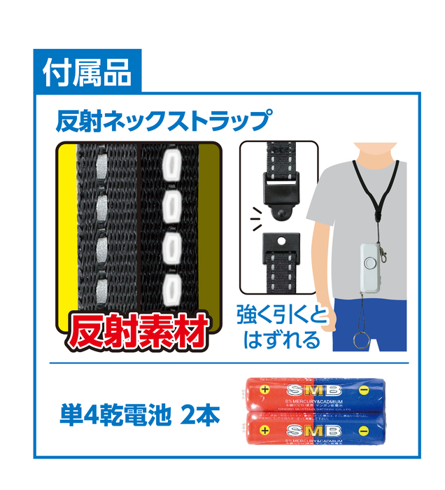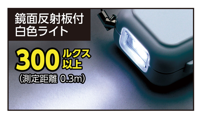 ●鏡面反射板付白色ライト_300ルクス以上(測定距離0.3m)●付属品・反射ネックストラップ(強く引くとはずれる)・電池が長持ち単4乾電池2本