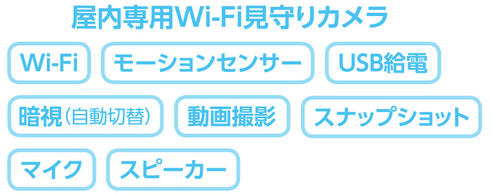 ●Wi-Fi●モーションセンサー●マイク●スピーカー●暗視(自動切替)●動画撮影●スナップショット