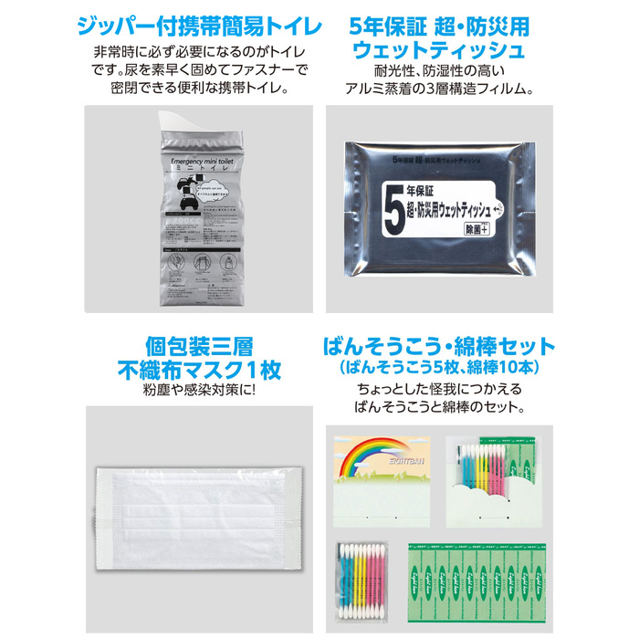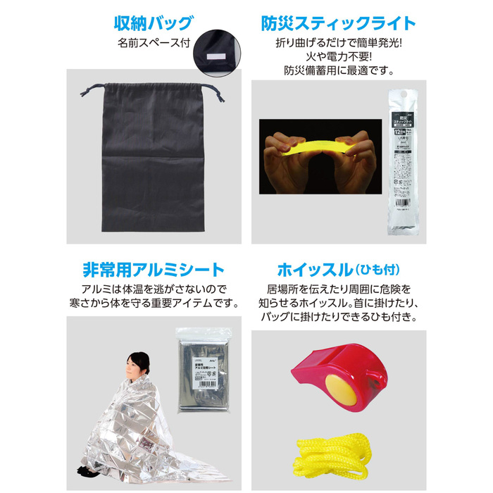 # セット内容ナイロンバッグ、防災スティックライト、防寒シート、ホイッスル(2色アソート)、ジッパー付携帯トイレ、防災用ウェットティッシュ、不織布マスク、綿棒(10本入り)、絆創膏(5枚)、無地てぬぐい、レインポンチョ、軍手(1双)