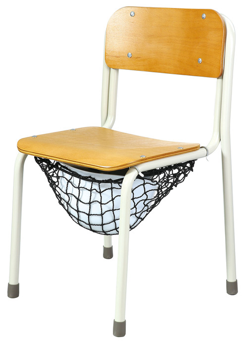 四隅のフックを掛けるだけで椅子の下にヘルメットを保管・常備できる