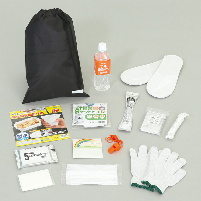 # セット内容ナイロンバッグ、防災用ウェットティッシュ、ポケット携帯トイレ、防災スティックライト、防寒シート、7年保存水500ml、不織布スリッパ(1足)、不織布マスク、軍手(1双)、ロープ3m、ホイッスル、ポケットティッシュ、綿棒(10本入り)、絆創膏(5枚)、包帯、コットン(3枚入り)、爪切り、ピンセット、はさみ、ケース、非常用食器折り紙(5枚入り)