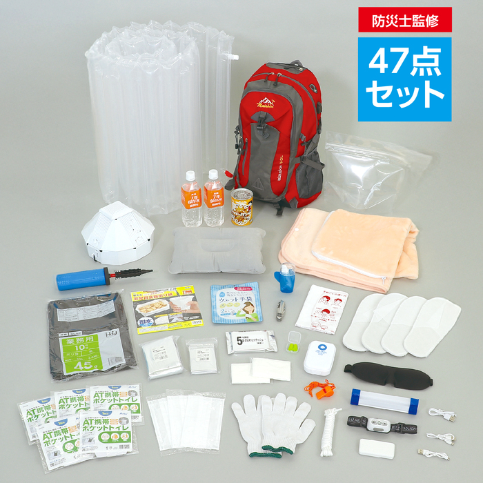 ライフライン復旧までに必要な分の非常食・保存水を含めた防災セットです。基本的な47点をセットにしています。防災士監修の厳選したアイテムを備えています。【内容】・大容量リュックレッド:複数のサブポケットで大容量だけどすっきり収納できます。バッグ本体に付属の充電用ケーブルを取り付けることができ、手持ちの充電器とつなげることでバッグから給電できます。バッグの底面、左右側面のベルトで内容物に応じてバッグの厚みを調整できます。・5年保証・超防災用ウェットティッシュ20枚入:業界最長、「5年保証」の防災用のウェットティッシュです。・ATトイレストック1回用:長期保存、非常時に使える水不要トイレです。丈夫で破れにくい汚物袋と水分を素早く吸収する凝固剤で、災害時に役立ちます。・2WAYLEDライト(17cm):緊急時や作業時に使用できるLEDライトです。持ち運びしやすく用途に合わせた使用が可能です。マグネット付きなので様々な場所に設置も可能!懐中電灯のように遠くまでスポットで照らせるトップLEDライトと、作業灯やデスクライトのように周囲全体を広く照らす側面LEDライトの2種類の点灯を切り替えることができます。充電時間:約6~10時間、連続使用時間:約2.75時間。充電池内蔵。・非常用アルミ防寒シート:アルミ素材で保温に優れた防寒シートです。たためばポケットにも入るコンパクトサイズ。銀色でキラキラ光り目立つので、救出時の発見に役立ちます。・黒部7年保存水500ml:長期保存可能な保存水です。安心の加熱殺菌処理・耐熱ボトル使用。・不織布スリッパ:前閉じで履きやすい使い捨てスリッパです。・不織布マスク:ノーズワイヤー入りの不織布マスクです。衛生的な個包装。・エマージェンシー3点セット:軍手、ロープ、笛がセットになった緊急時に便利なセットです。・ポケットティッシュ:シンプルなポケットティッシュです。8組入り。・エイドチーム2:携帯しやすいプラスチックケース入り。綿棒10本、エイトバン5枚、ワンタッチ包帯1点、コットン3点、爪切り1点、ピンセット1点、はさみ1点のセットです。・非常用食器折り紙:水に強いストーンペーパーを使用しています。コップや皿の折り方付きで、災害時に役立ちます。水洗い可能なので、繰り返し使えます。緊急時のメモにも!・hokkaのカンパン:アレルギー物質の乳・卵を使わず、独自の製法で長時間イースト発酵させてからじっくりと焼き上げた飽きのこない素朴な味で、いつでもどこでも頼りになる、昔から変わらぬ懐かしい味が自慢です。金平糖は口解けが良く、水分の少ないカンパンを食べ易くしてくれます。プルトップの缶は手で簡単に開けることができるのでお子様でも簡単に開けられます。・歯ブラシセット:コップ型ケース、歯ブラシ、歯磨き粉の3点セット。(色取り混ぜ商品です。お選びいただけません。)・水のいらない泡なしシャンプーウェット手袋:水のない環境でも、髪や頭皮を清潔にする手袋型のウェットシートです。手袋だから使いやすく、驚くほどサッパリと清潔に。・ポリ袋45L(10枚入):中身が見えない黒いポリ袋です。簡易トイレやゴミ袋、防寒具としても使えます。立体スポンジアイマスク:避難所などでの安眠のために便利なアイマスクです。立体的でフィット感があります。・持ち運びエアー枕:空気を入れて膨らませる枕です。使用しないときはコンパクトに折りたためます。・耳栓:避難所などでのストレス削減に。環境音のみシャットアウトするので安心。・ATクッションブランケットピンク:大きめサイズのブランケットです。使わないときはケースに入れてクッションになります。・緊急用給水袋3Lマチ付:約3Lの水が給水できます。コンパクトでかさばらない!・非常用アルミ防寒ポンチョ:両手が使える防寒ポンチョです。軽量で動きやすく、コンパクトに収納できます。