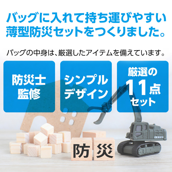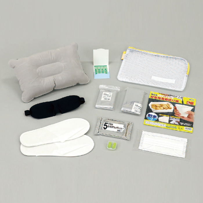 # セット内容連絡袋、防寒シート、絆創膏(2枚)、非常用食器折り紙(5枚入り)、不織布マスク、エアー枕、アイマスク、耳栓(1組)、防寒寝袋、不織布スリッパ(1足)、防災用ウェットティッシュ