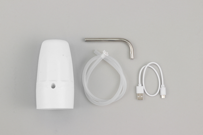 # 仕様φ69×127mm(ノズル含まず)、●バッテリー容量/1200mA●電力/4w●電圧/DC-5V●フル充電所要時間/約4時間●給水量/1.7L/min●充電用USBケーブルA-MicroB(長さ:24.5cm)●適合ボトルサイズ/口径17~58mm