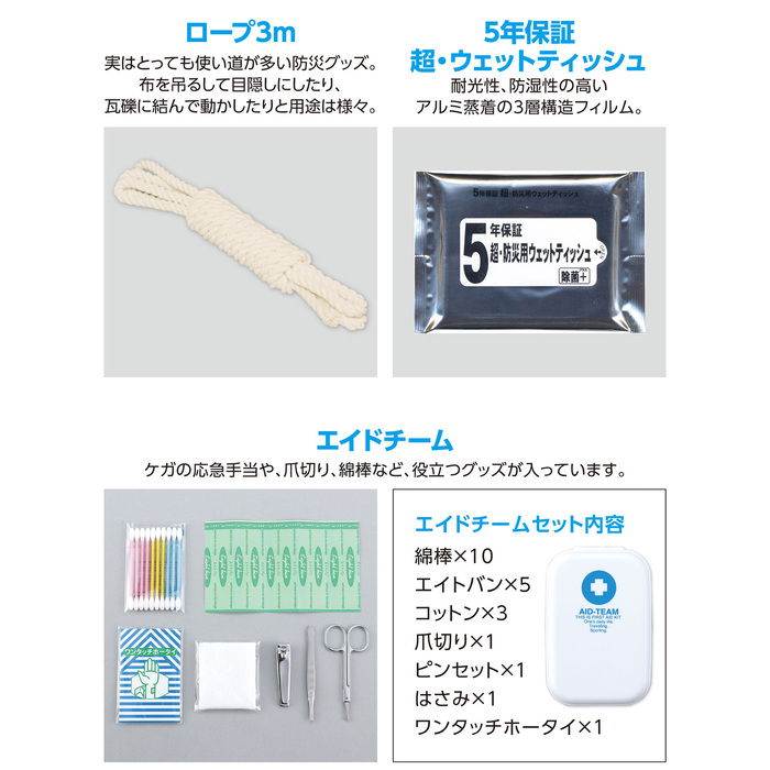 # セット内容防災リュック、静音防寒シート、緊急用呼子笛、ジッパー付携帯トイレ、綿棒(10本入り)、絆創膏(5枚)、包帯、コットン(3枚入り)、爪切り、ピンセット、はさみ、ケース、非常用食器折り紙(5枚入り)、軍手(1双)、不織布マスク×3、給水袋5L、2WAYランタンライト、単3電池(3本組)、エアー枕、アイマスク、耳栓(1組)、静音防寒寝袋、歯ブラシ、歯磨き粉、コップ(2色アソート)、不織布スリッパ(1足)、ロープ3m、防災用ウェットティッシュ
