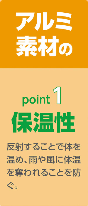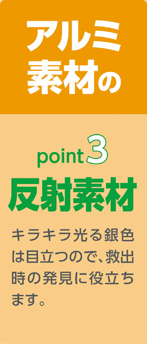 薄い!軽い!暖かい!アルミ素材のpoint1保温性_反射することで体を温め、雨や風に体温を奪われることを防ぐ。point2コンパクト_たためばポケットにも入るコンパクトサイズなので、防災リュックに入れたり、アウトドアにも。point3反射素材_キラキラ光る銀色は目立つので、救出時の発見に役立ちます。