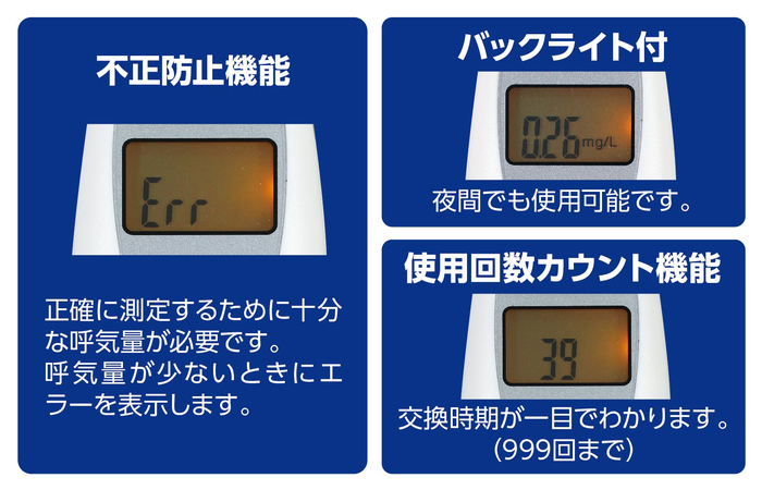 # 仕様約36×95×18mm●検知方式:半導体ガスセンサー●呼気中アルコール濃度測定範囲:0.00~0.95mg/L●センサー使用回数表示:カウント機能付き(0~999回まで)999回を超えると「SENSOR」と表示されます●センサー使用寿命:購入後1年経過またはセンサーの使用回数1000回1000回以上になると精度の保証ができなくなります●使用温度範囲:5~35℃●保管温度範囲:0~40℃●電源:単4アルカリ乾電池×2本(別売)●自動OFF機能:測定結果は約5秒間表示その後自動で電源が切れます