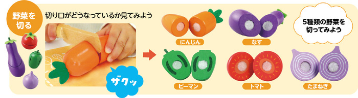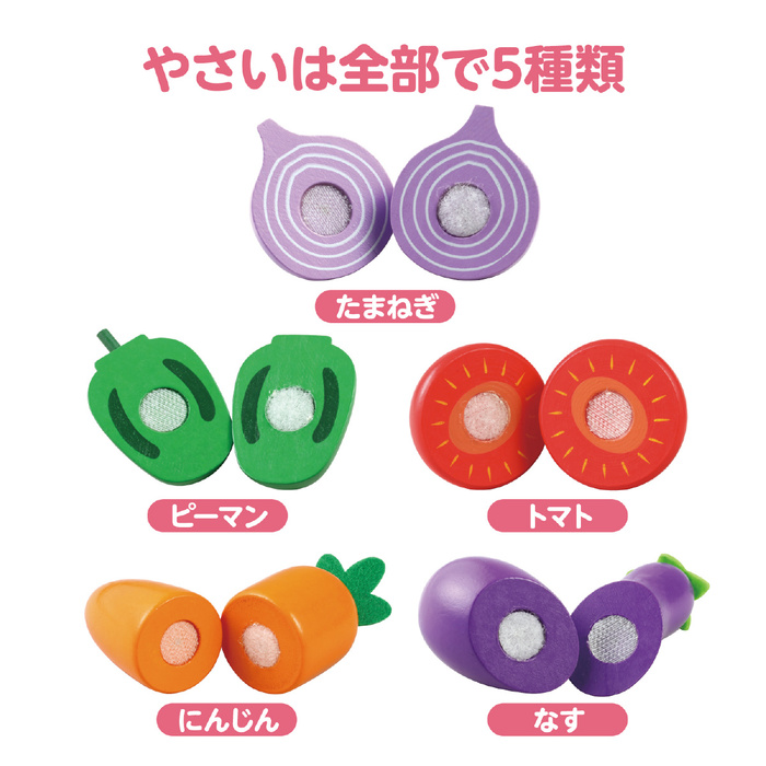 # セット内容まな板×1、包丁×1、やさい5種セット(にんじん×1、ピーマン×1、なす×1、たまねぎ×1、トマト×1)
