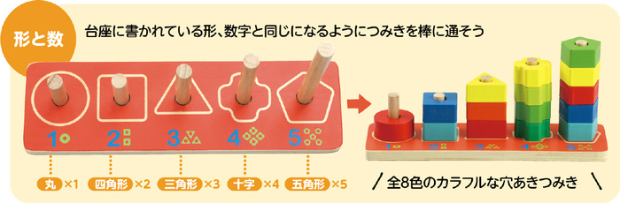 # セット内容丸×1、四角形×2、三角形×3、十字×4、五角形×5、台座×1