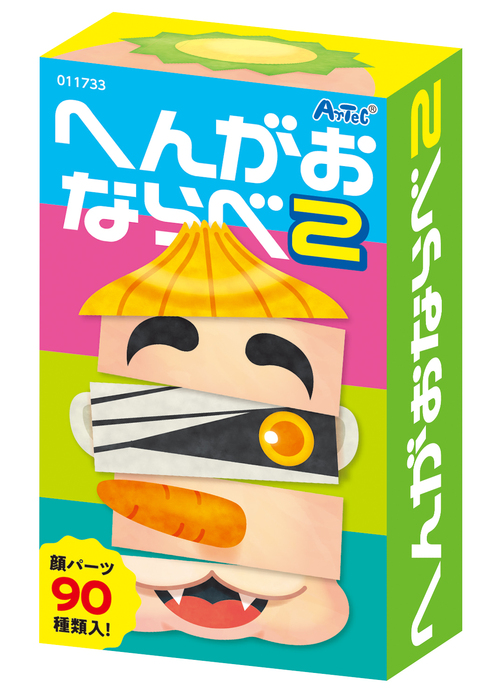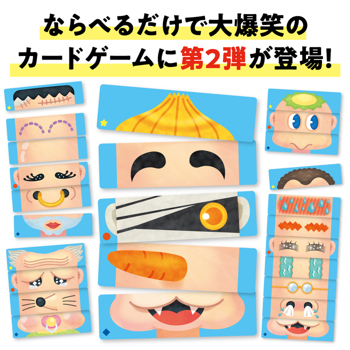 へんがおならべカードゲームの第二弾です。かおカードを並べて変顔をつくるカードゲームです。おもしろいイラストで、数字が読めない小さなお子様でも楽しめるゲームです。90枚のかおカードを山札から順番に引き、引いたカードで顔を作っていくゲームです。あたまカード、おめめカード、おくちカードの3枚が揃えば顔は完成で、山札がなくなった時に一番多く顔をつくっていた人が勝ちです。第一弾の「へんがおならべ」を混ぜて遊ぶと、もっとたくさんの顔がつくれます。