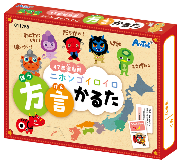 クセになる方言が盛りだくさんの楽しいかるたです。読み上げられた方言を聞いて、それに合う都道府県を取るかるたです。全国47都道府県すべての方言カードがあります。