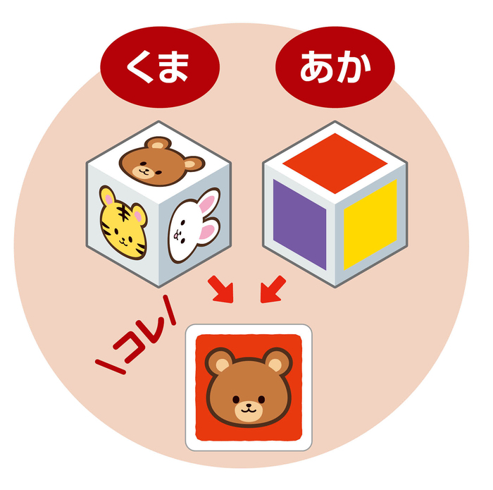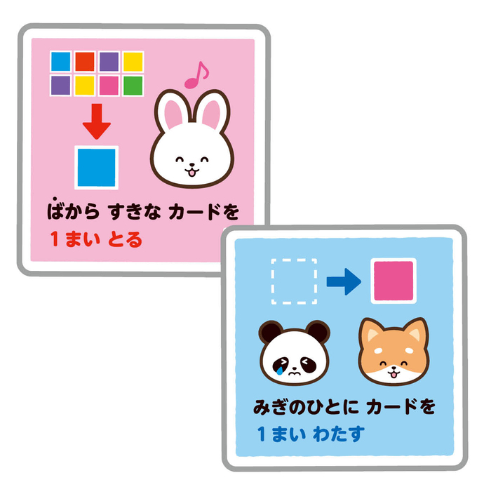 読み札の代わりにサイコロを使うかるたです。読み札がないので、文字が読めない小さなお子様でも楽しめます。6種類のどうぶつと6つの色の組み合わせに合う取り札をもらえるゲームで、すでに盤面からそれに合うカードがなくなっている場合は、イベントカードを取ってその指示通りに動きます。同じ色、同じ動物を4枚以上揃えると加算点があり、最終的に一番高い得点の人が勝利です。