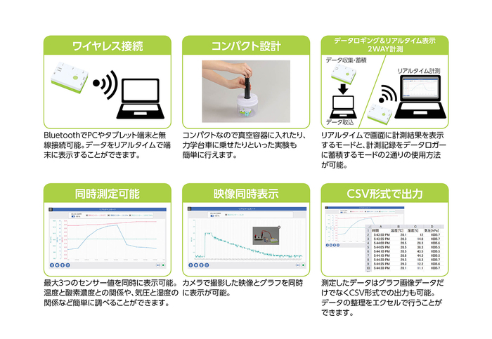 PCやタブレット端末にワイヤレスでつながる教育用データロガーです。