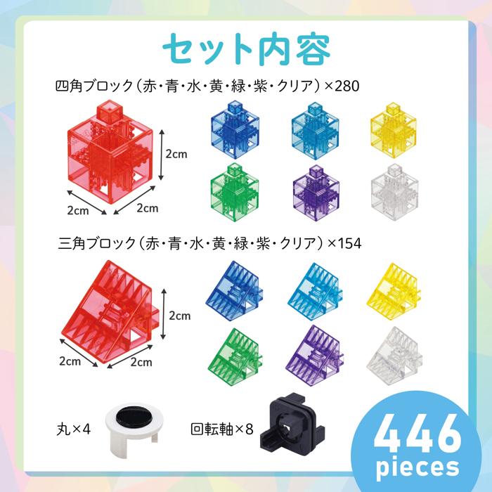 # セット内容全446ピース(四角:赤/青/緑/黄/水/紫/クリア各40コ、三角:赤/青/緑/黄/水/紫/クリア各22コ、目玉パーツ4コ、回転軸8コ)