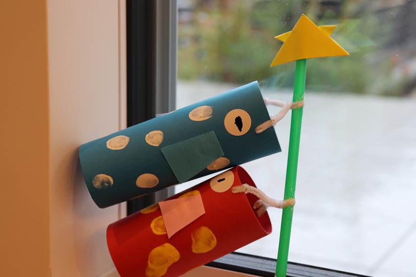 新聞紙を丸めて筒状にし、鯉のぼりの形に仕上げる工作です。