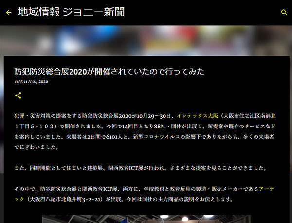 大阪府八尾市を中心に、地域から情報を発信する『ジョニー新聞』で、『防犯防災総合展2020』でのアーテックの展示ブースの様子が紹介されました。