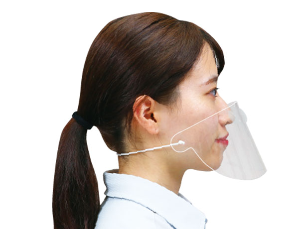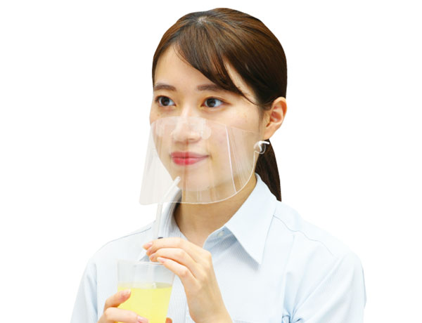 本商品は、0.2mm厚の透明PET樹脂シートを組み立ててマスクとして使用するものです。パッド部を鼻に固定することで顎まわりがフリーになり、話す時に邪魔にならず装着したまま飲食することが可能です。また、パッド部を顎に固定し、逆向きで使用することもできます。シート部にはくもり止め加工を行っており、首の後ろにゴム紐を通して使用しますので、耳が痛くなることもありません。アルコール清拭により、消毒して繰り返し使うことが可能です。マイクをつかったスピーチや歌唱、笛などの楽器演奏もマスクを着けたまま行えます。