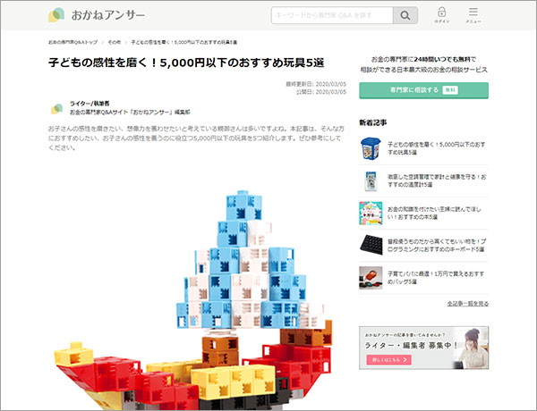 お金に関する無料の専門家Q&Aサービス「お金アンサー」の「子どもの感性を磨く!5,000円以下のおすすめ玩具5選」で、『アーテックブロック』が紹介されました。