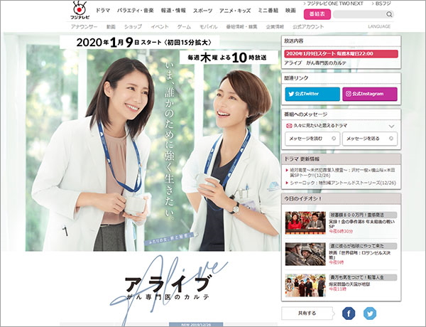 2020年1月9日スタート・毎週木曜夜10時放送のフジテレビ連続ドラマ『アライブ