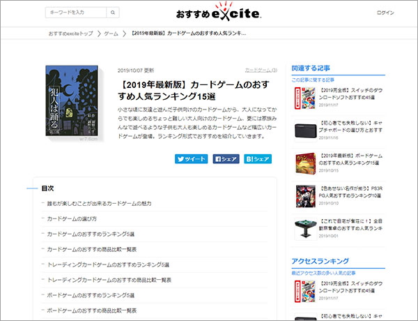 ランキングサイトの「おすすめexcite」の「【2019年最新版】カードゲームのおすすめ人気ランキング15選」で、アーテックの『夜店でおかいものすごろく』が第2位に選ばれました。