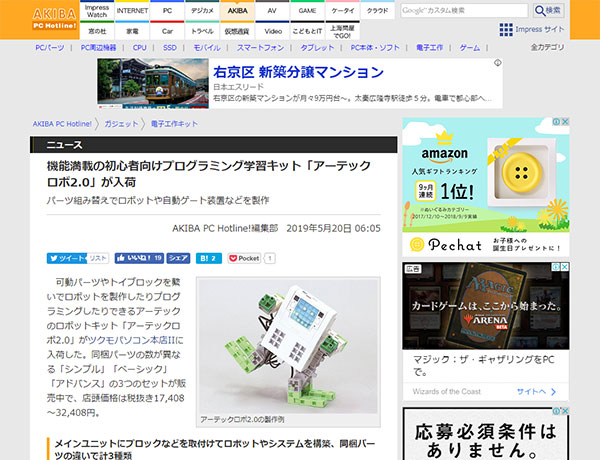買い物に役立つ秋葉原のマーケット情報サイトの「AKIBA PC Hotline!」で、プログラミング学習キット『アーテックロボ2.0』が紹介されました。