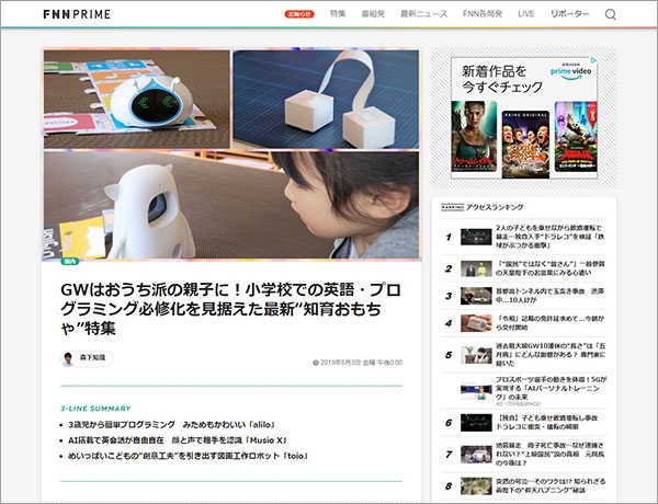 フジテレビ報道局ニュースサイト「FNNPRIME」の「小学校での英語・プログラミング必修化を見据えた最新“知育おもちゃ”特集」に、プログラミングトイ「alilo」(アリロ)が掲載されました。