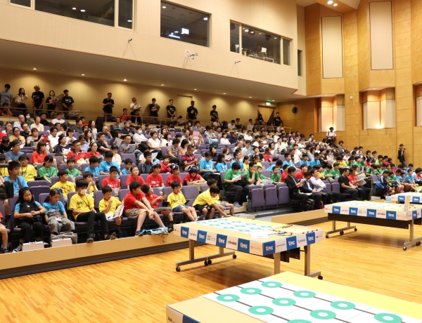 Challenge2018)の決勝大会(主催:URC実行委員会/大阪府)が、2018年9月8日(土)、大阪大学吹田キャンパス・コンベンションセンターで行われました。本競技会は子どもたちがロボットプログラミングキット『アーテックロボ』を利用して制作したロボットにより、ゴールまでの速さや正確さを競い合うというもの。今年で2回目となる2018大会は、全国8会場(東北・北関東・南関東・北陸・東海・近畿・中四国・九州)で地区大会予選が開催され、各地の教育委員会や教育機関の後援のもと160チームのなかから勝ち抜いた上位29チームに、海外から特別参加した7チームが加わり、総勢36チーム83名が決勝大会に出場しました。