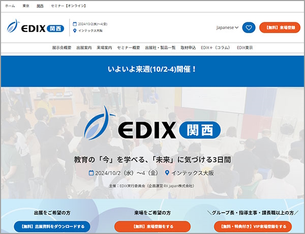来る10月2日(水)~10月4日(金)、「第7回 EDIX(教育総合展)関西(EDIXK24)」に出展いたします。