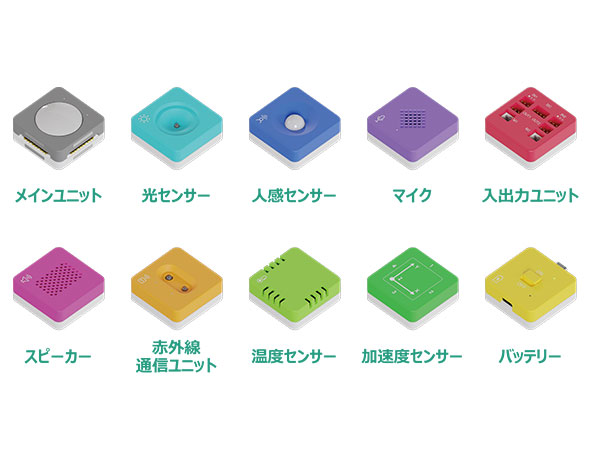 メインユニットに9種類の拡張ユニットを接続することで、誰でも簡単にプログラミング、IoT体験ができます。