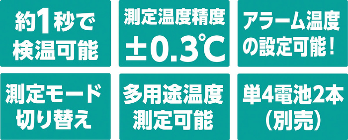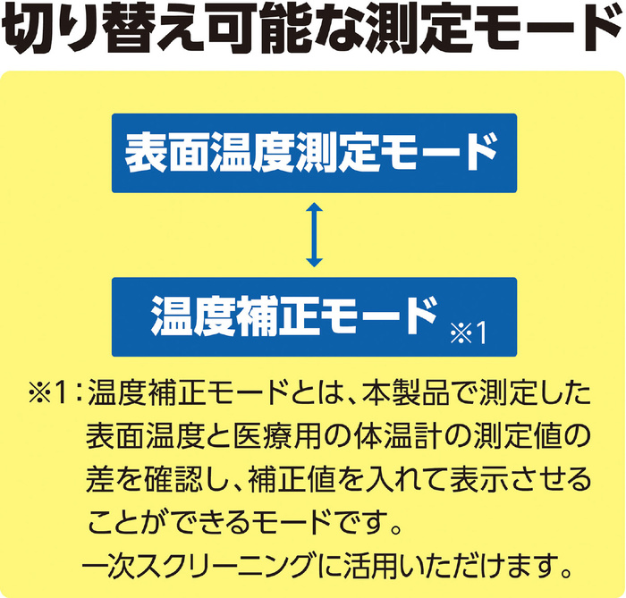 ●オートパワーオフ機能 測定終了後、約15秒で電源が切れます。●切り替え可能な測定モード 表面温度測定モード?温度補正モード※1:温度補正モードとは、本製品で測定した表面温度と医療用の体温計の測定値の差を確認し、補正値を入れて表示させることができるモードです。一次スクリーニングに活用いただけます。