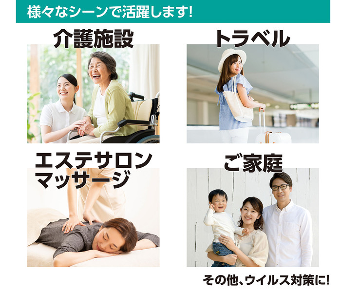 様々なシーンで活躍します!介護施設・トラベル・エステサロン・マッサージ・ご家族・その他、ウイルス対策に!