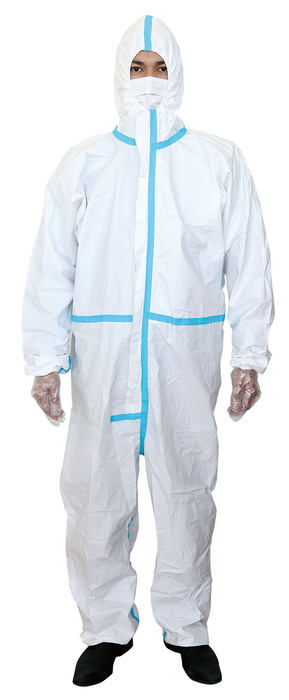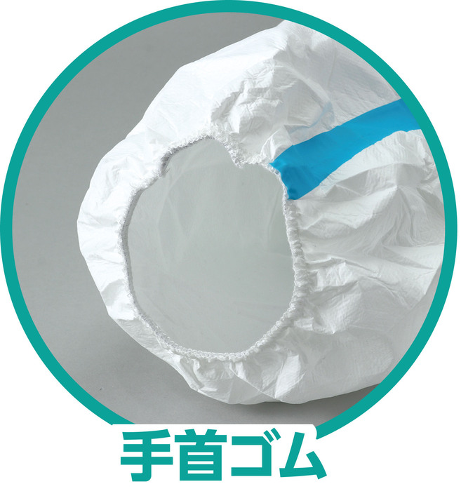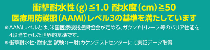 # 仕様総丈:約170cm、胸囲:約124cm、袖丈:約85cm、上着の裾囲:約16cm、ズボンの裾囲:約22cm、適正身長:155~165cm衝撃耐水性(g)≦1.0耐水度(cm)≧50医療用防護服(AAMI)レベル3の基準を満たしています。