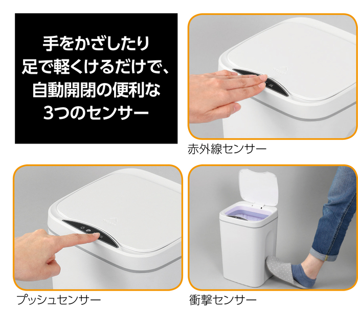 手をかざしたり足で軽くけるだけで自動開閉の便利な3つのセンサー