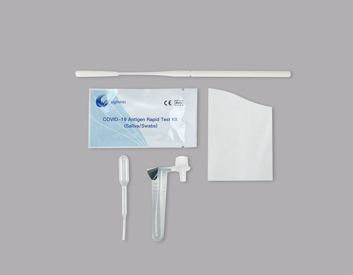 # セット内容検査カセット×1、唾液採取袋×1、抽出管(希釈液入り)×1、スポイト×1、鼻腔用綿棒×1、取扱説明書×1