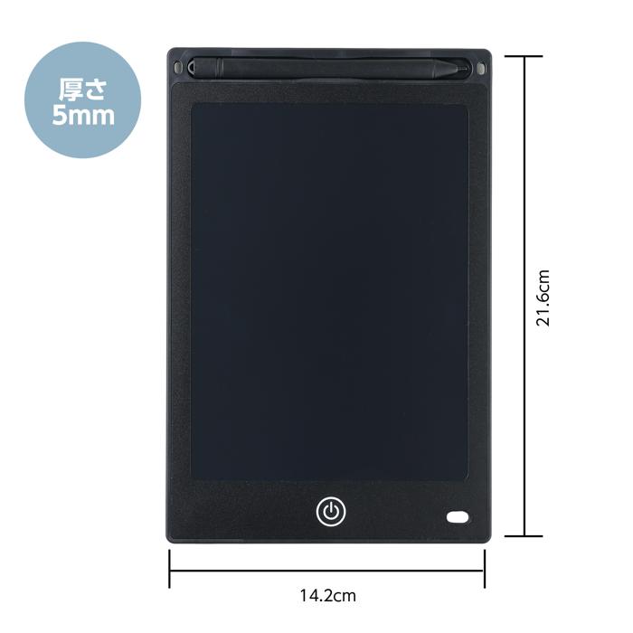 タッチペンで自由に描いて、ボタン一つで簡単に消去!電池式でいつでも手軽に使える電子メモ帳です。事務用品としても、遊び道具としても活躍します。コンパクトでシンプルな黒色デザインがどんなシーンでもピッタリです。