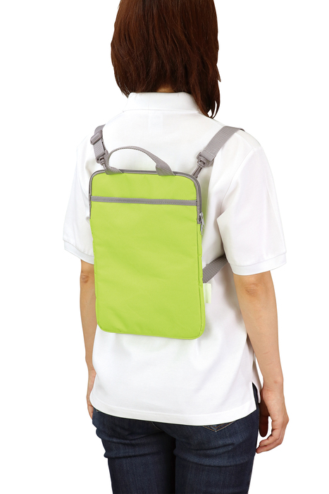 ハンドキャリー、ショルダー、リュック、椅子に取り付けもできる4WAYのタブレットケースです。開け閉めしやすいWファスナーです。ネームタグもついています。11.6インチまでのPC・タブレットに対応しています。内寸約31.5×21.5cm。