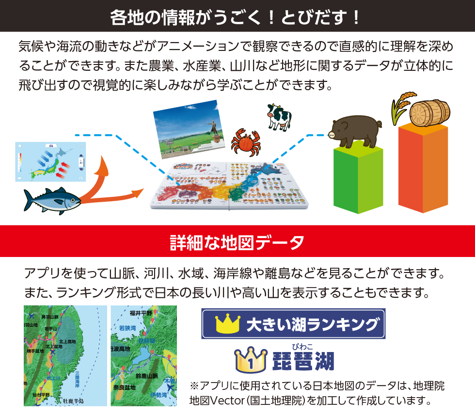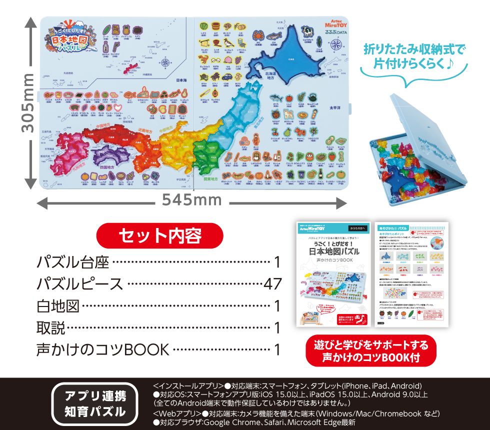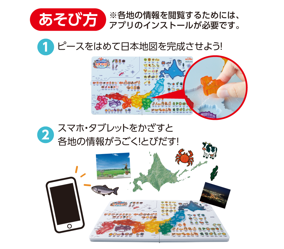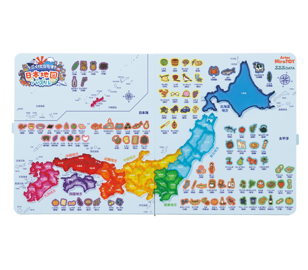 パズルを超えた学び体験。地形や名所、特産品、さらには海流の動きまでを網羅した詳細な地図データを、オリジナルアプリと連動して深く学べます。手で組み、目で見て、アプリで探究する新しい地図パズルです。
