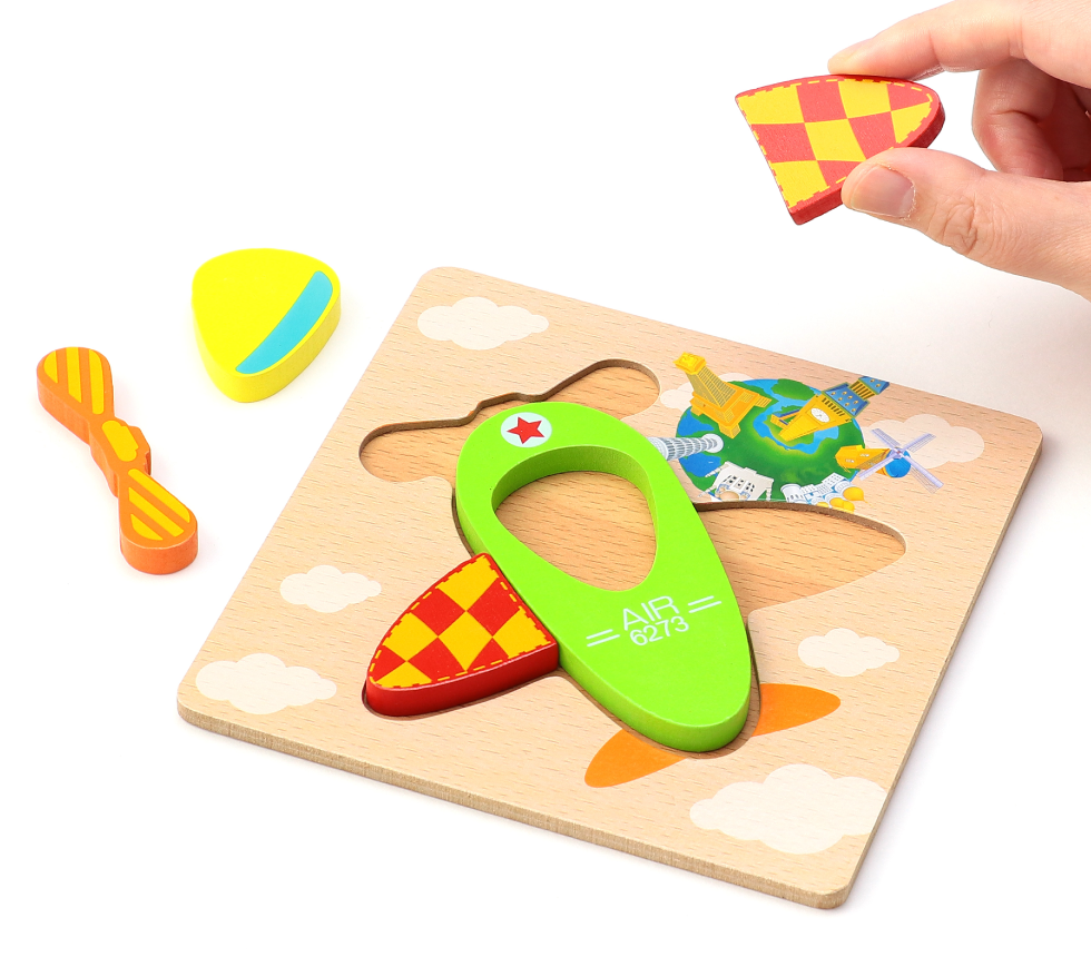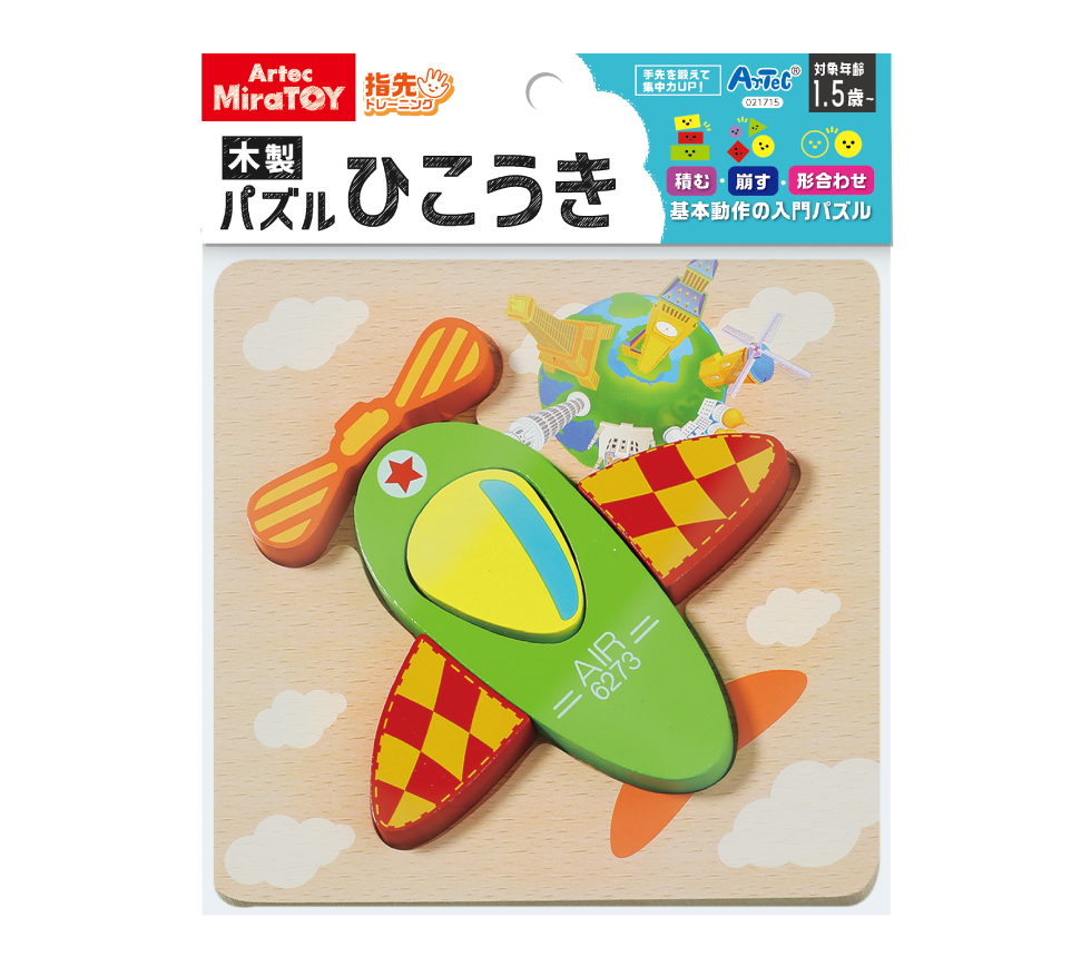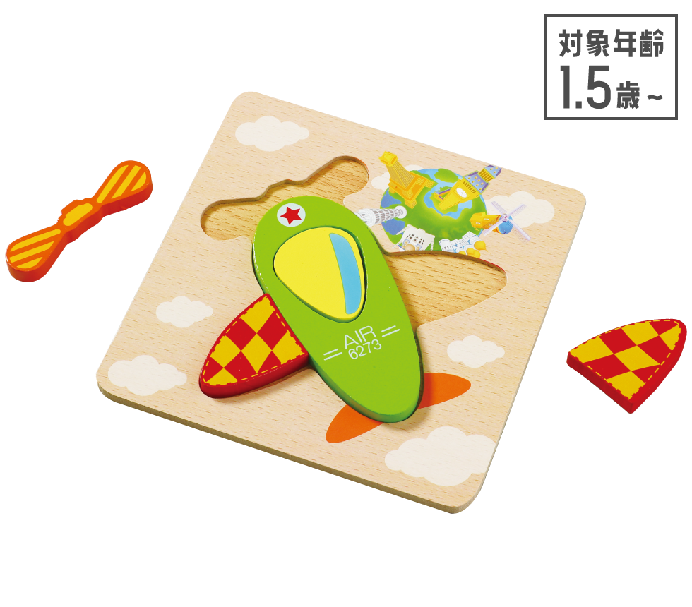 形合わせや積み木遊びができるひこうき型の木製パズルです。カラフルで大きいピースを使っているので、パズルが初めてのお子さまでも、簡単に遊んでいただけます。