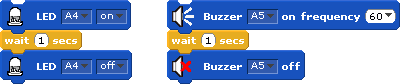 - Insert a wait 1 sec. block and check to see if your LEDs and Buzzers are working.